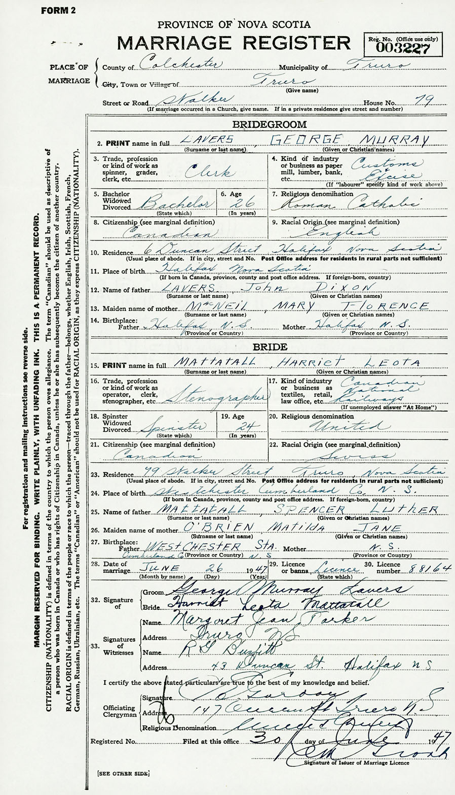 28. Date of marriage June 26 1947 29. By license or banns License 30. License number 88164