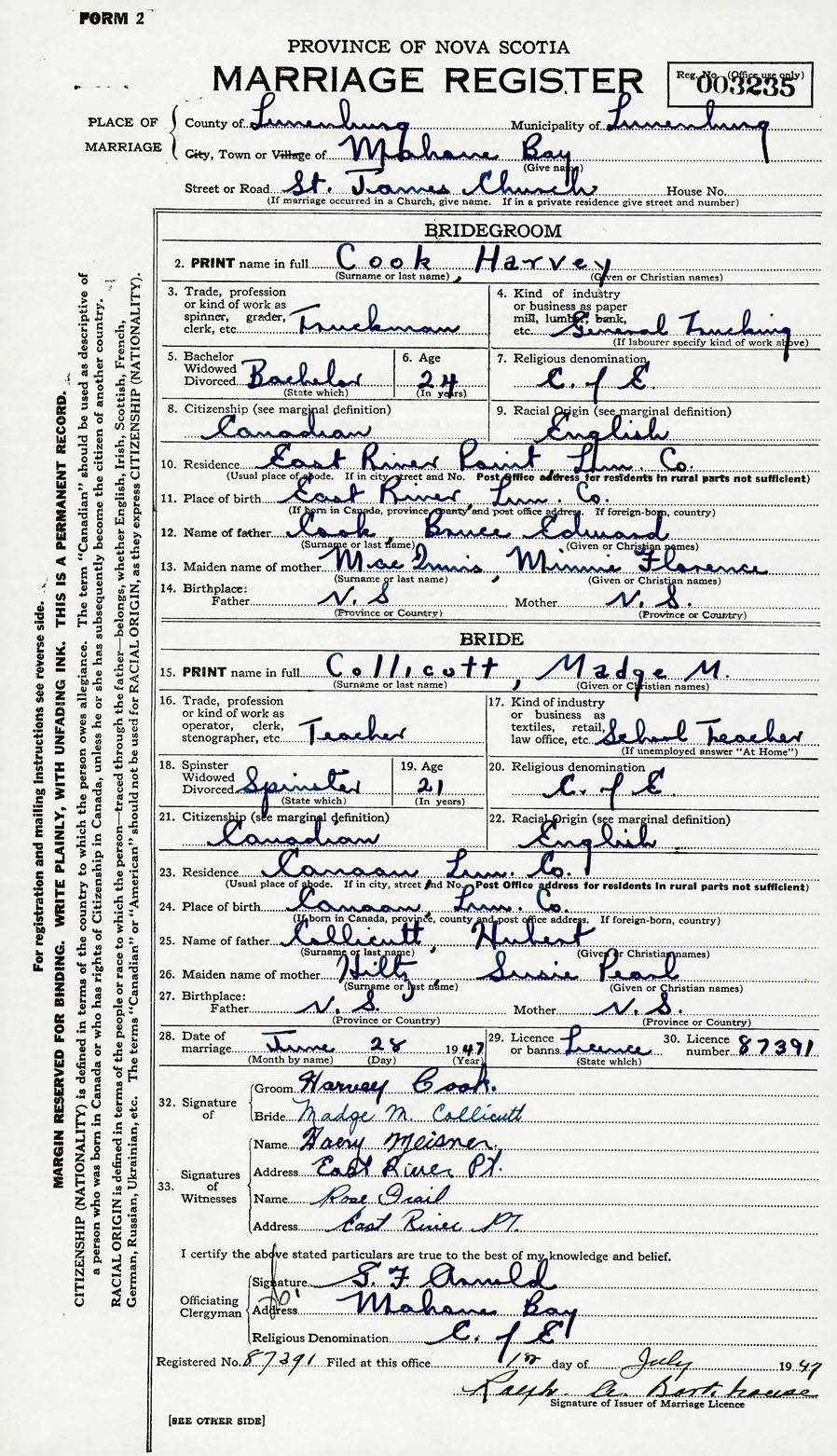28. Date of marriage June 28 1947 29. By license or banns License 30. License number 87391