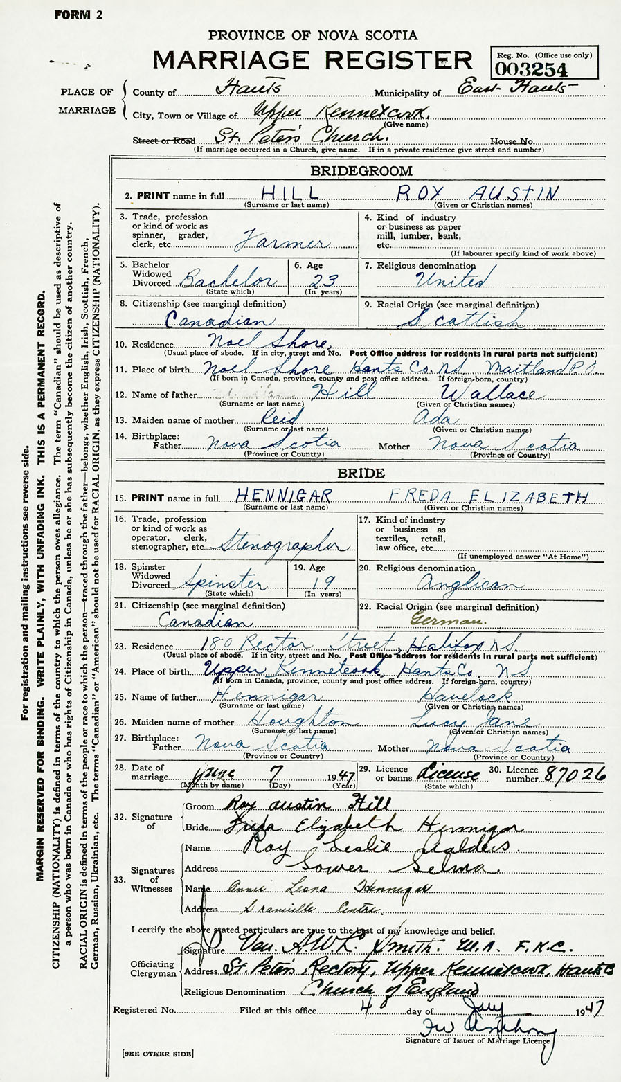 28. Date of marriage June 7 1947 29. By license or banns License 30. License number 87026