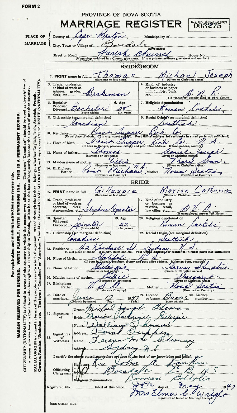 28. Date of marriage June 17 1947 29. By license or banns License 30. License number