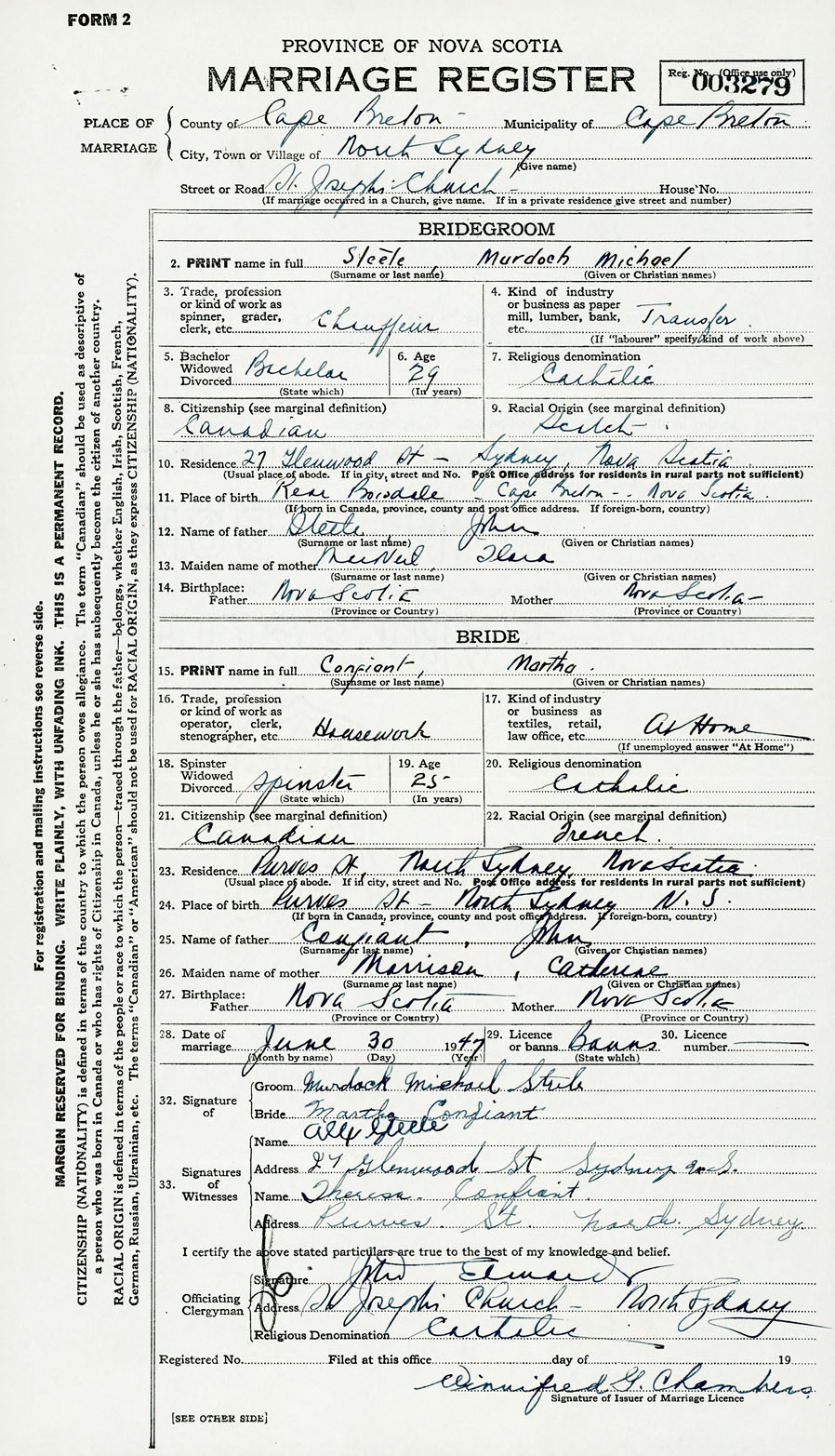 28. Date of marriage June 30 1947 29. By license or banns License 30. License number