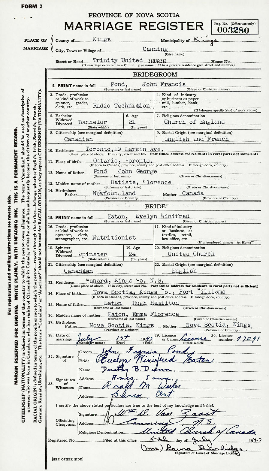 28. Date of marriage July 1 1947 29. By license or banns License 30. License number 87091