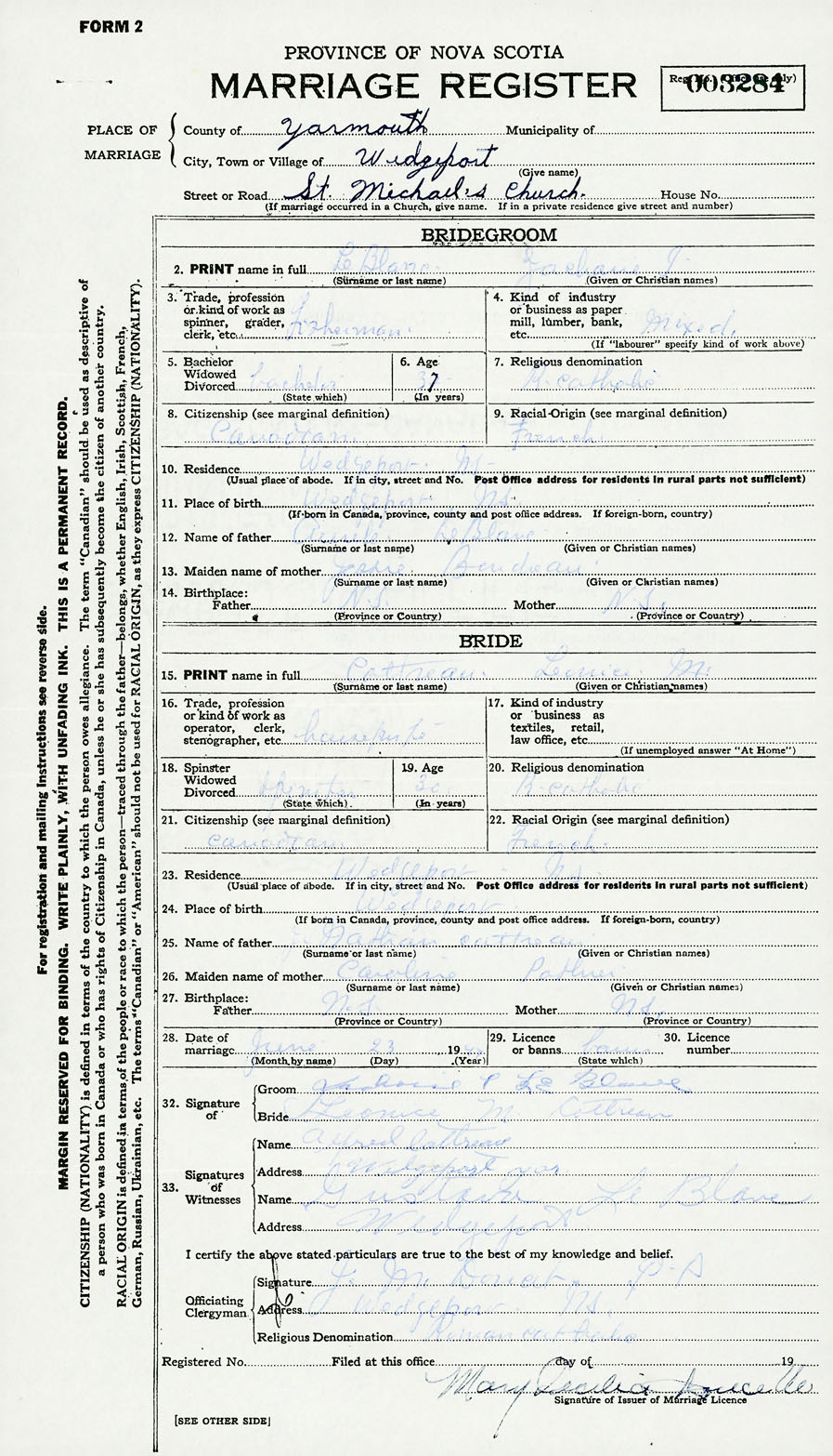 PLACE OF MARRIAGE County of Yarmouth