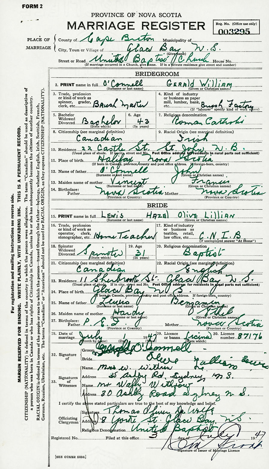 28. Date of marriage July 1 1947 29. By license or banns License 30. License number 87176
