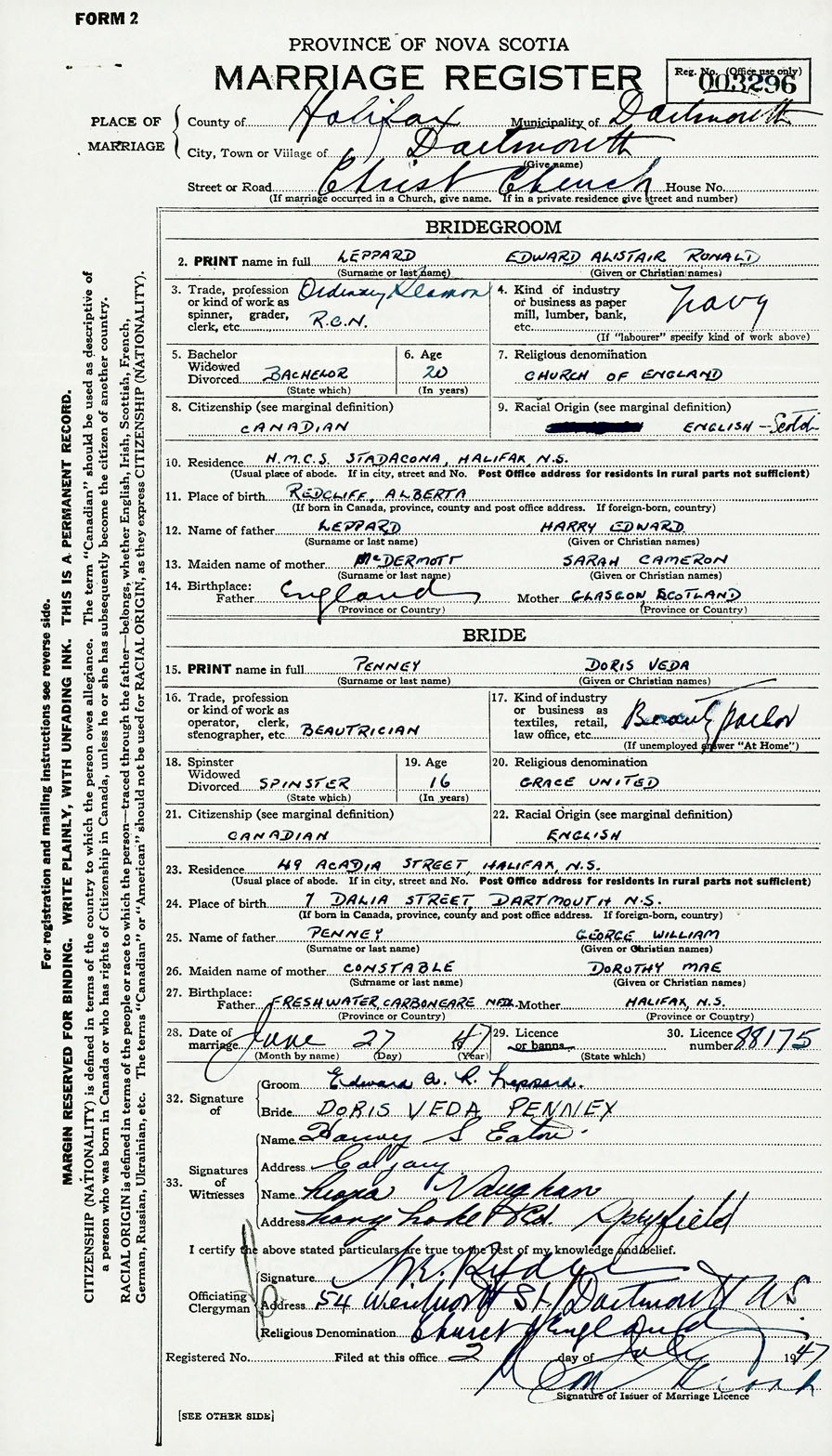 28. Date of marriage June 27 1947 29. By license or banns License 30. License number 88175