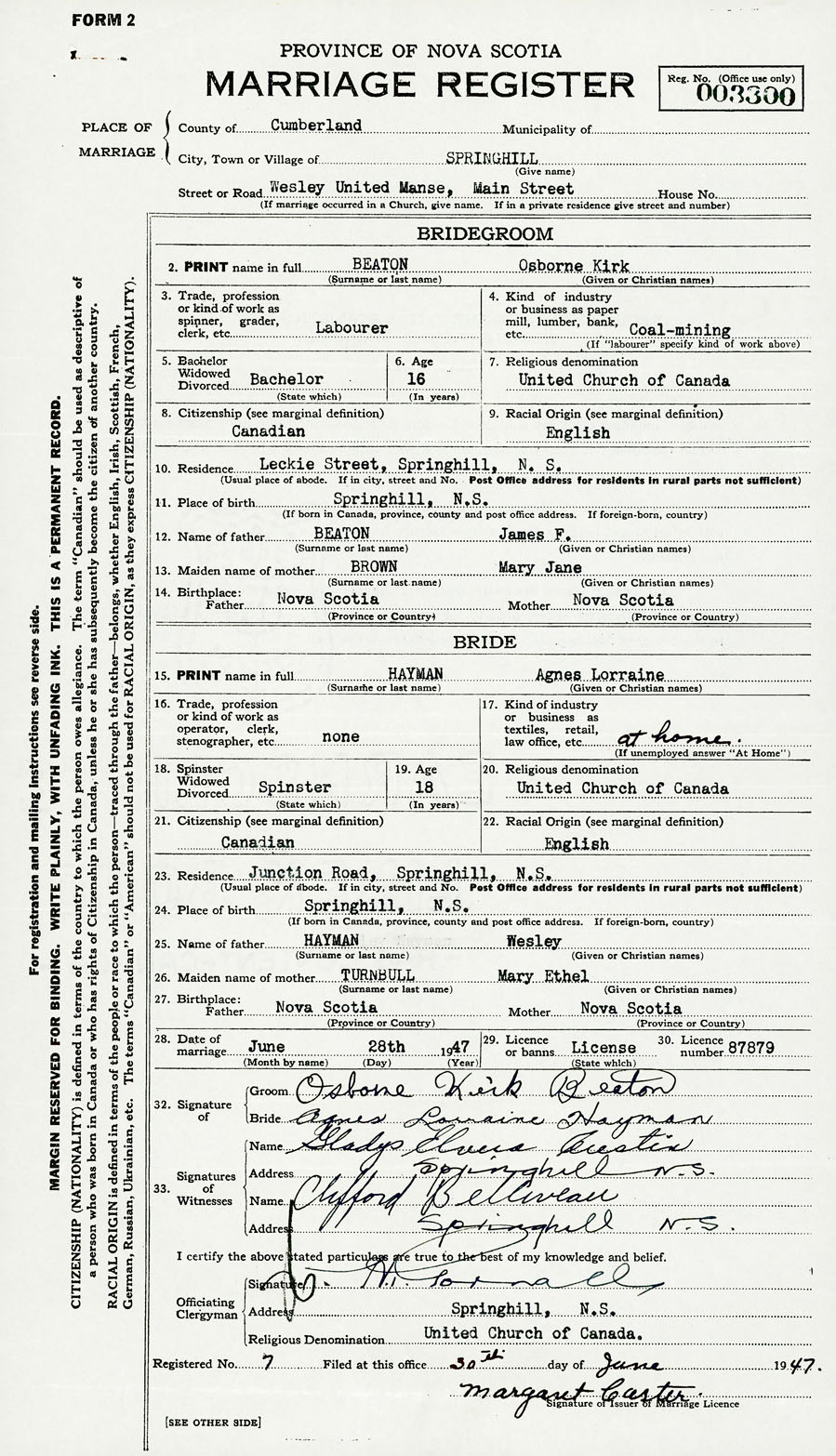 28. Date of marriage June 28 1947 29. By license or banns License 30. License number 87879