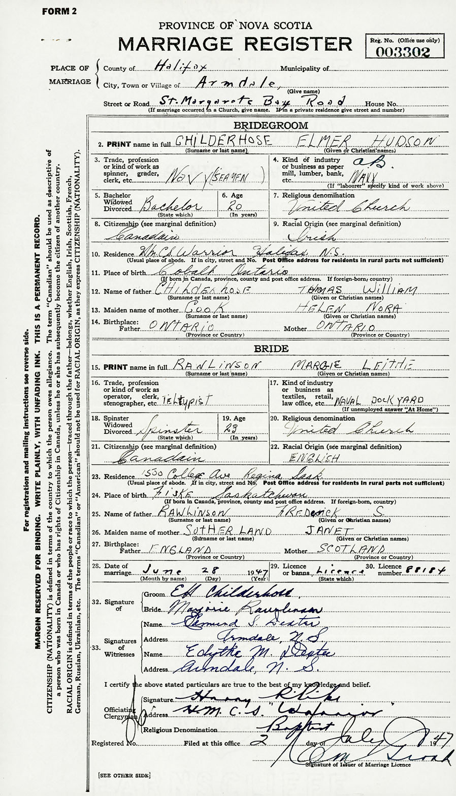 28. Date of marriage June 28 1947 29. By license or banns License 30. License number 88184