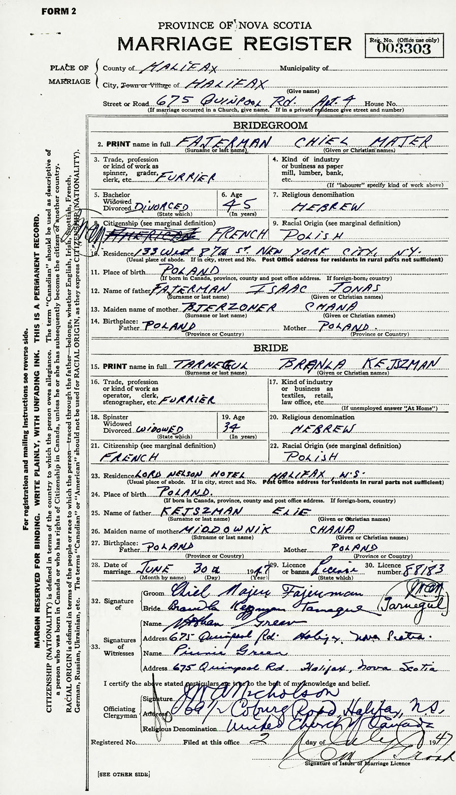 28. Date of marriage June 30 1947 29. By license or banns License 30. License number 88183