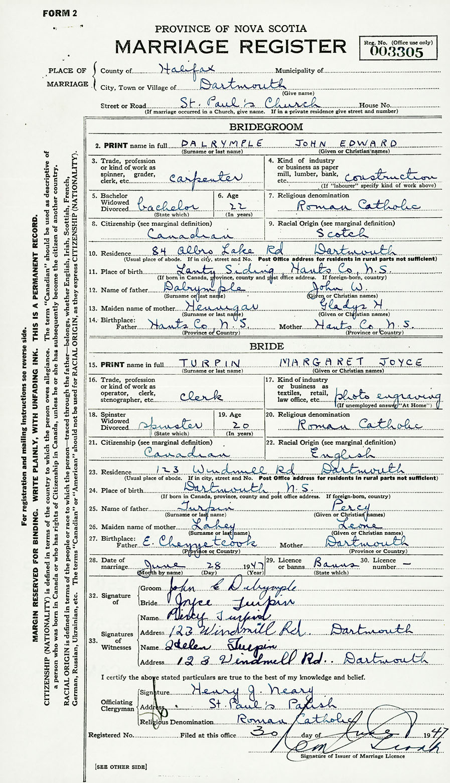 28. Date of marriage June 28 1947 29. By license or banns License 30. License number