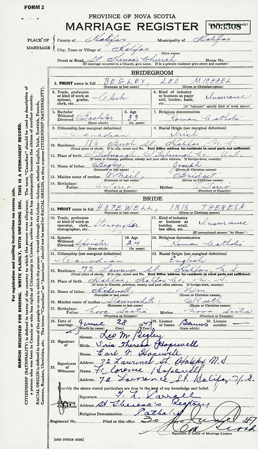 28. Date of marriage June 28 1947 29. By license or banns License 30. License number