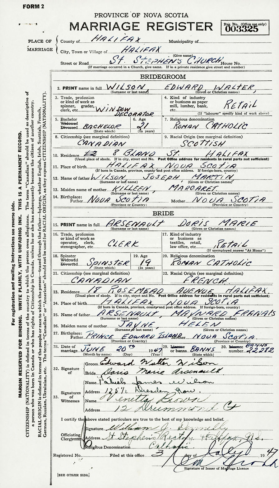 28. Date of marriage June 20 1947 29. By license or banns License 30. License number