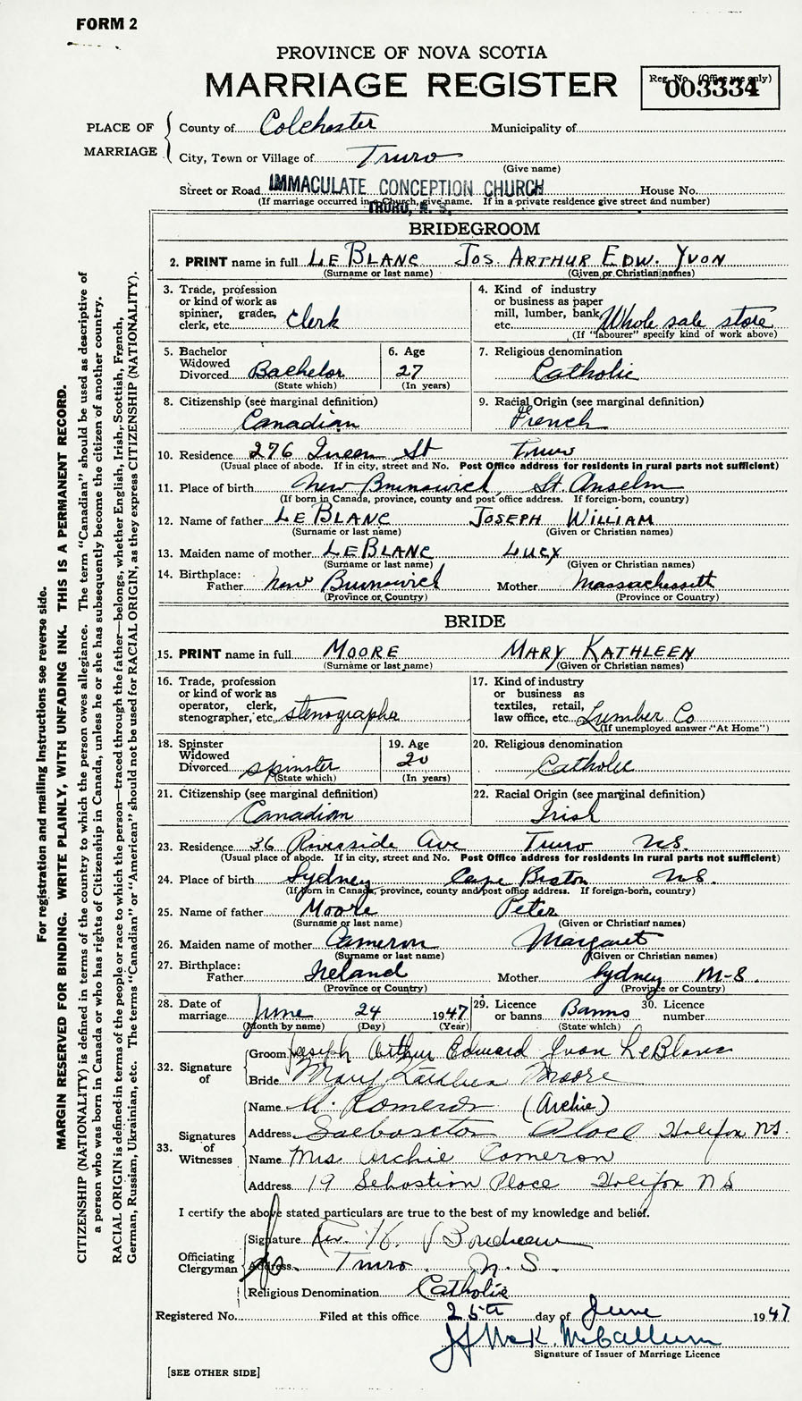 Groom Jos. Arthur Edw. Yvon LeBlanc