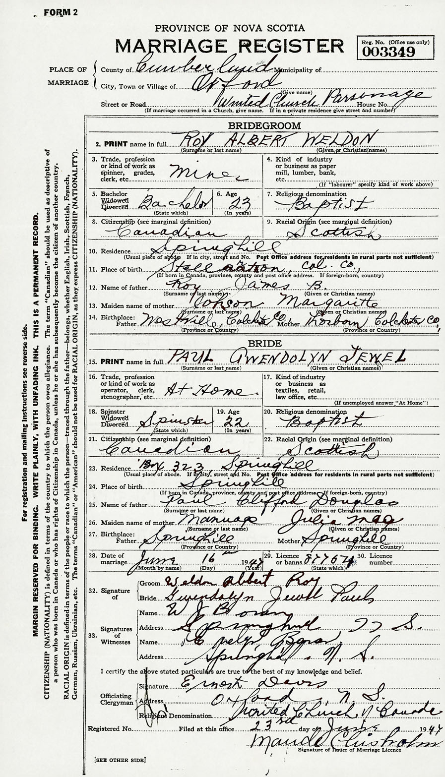 28. Date of marriage June 16 1947 29. By license or banns License 30. License number 87764