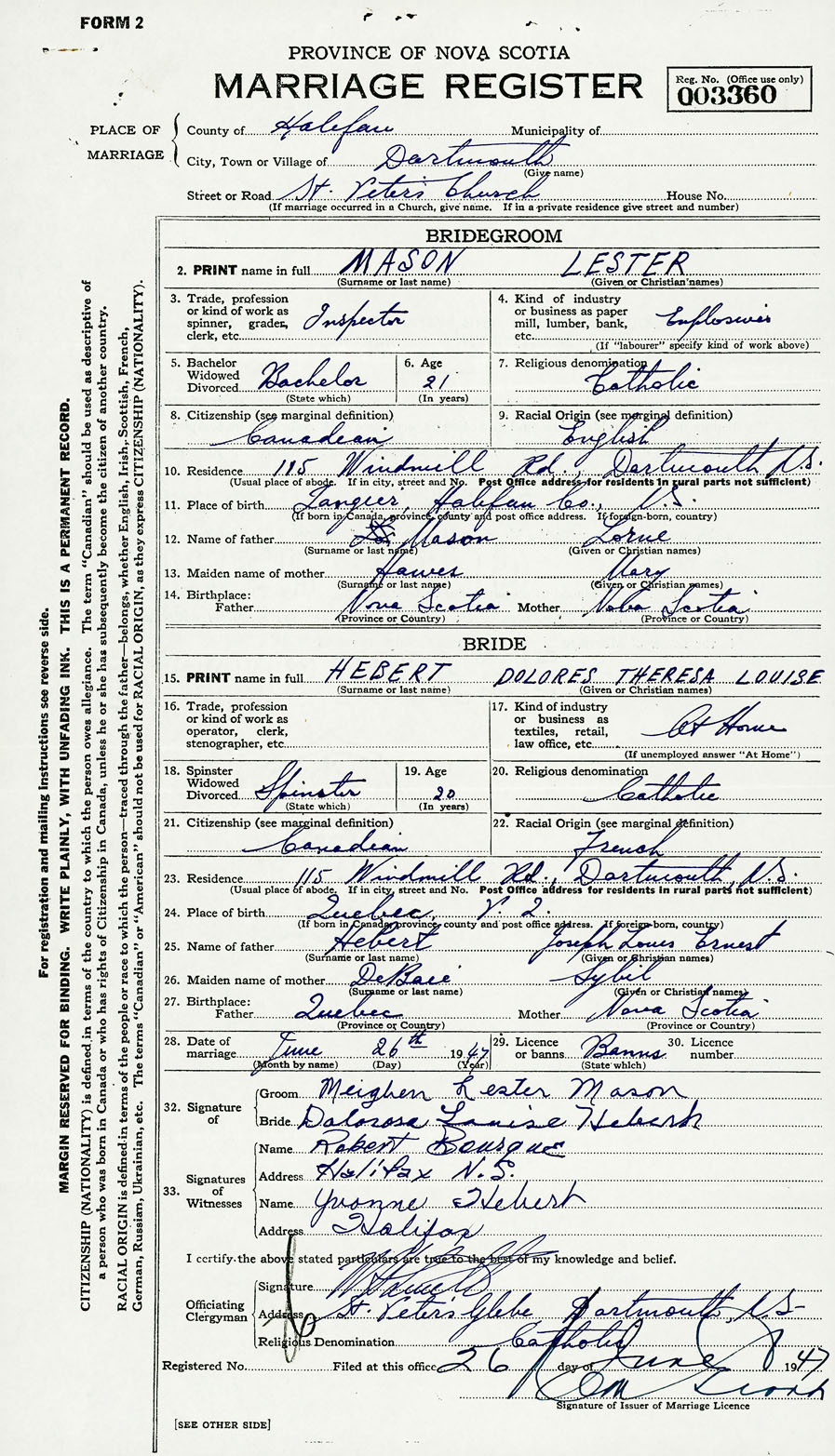 28. Date of marriage June 26 1947 29. By license or banns License 30. License number