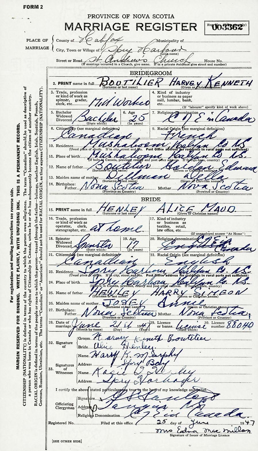 28. Date of marriage June 21 1947 29. By license or banns License 30. License number 88040