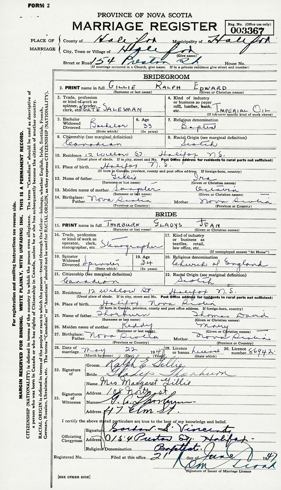 28. Date of marriage May 22 1947 29. By license or banns License 30. License number 86942