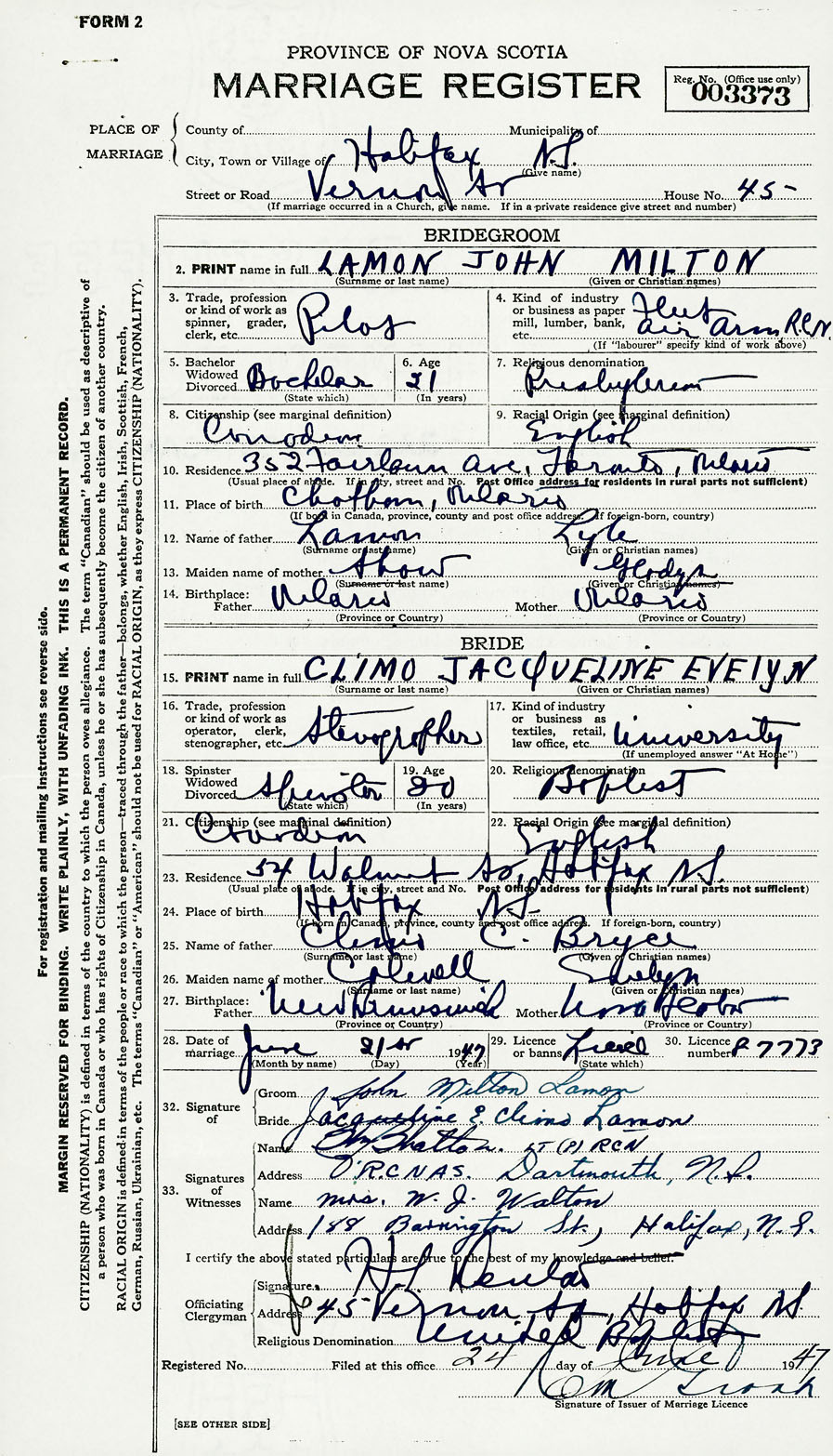 28. Date of marriage June 21 1947 29. By license or banns License 30. License number 87773