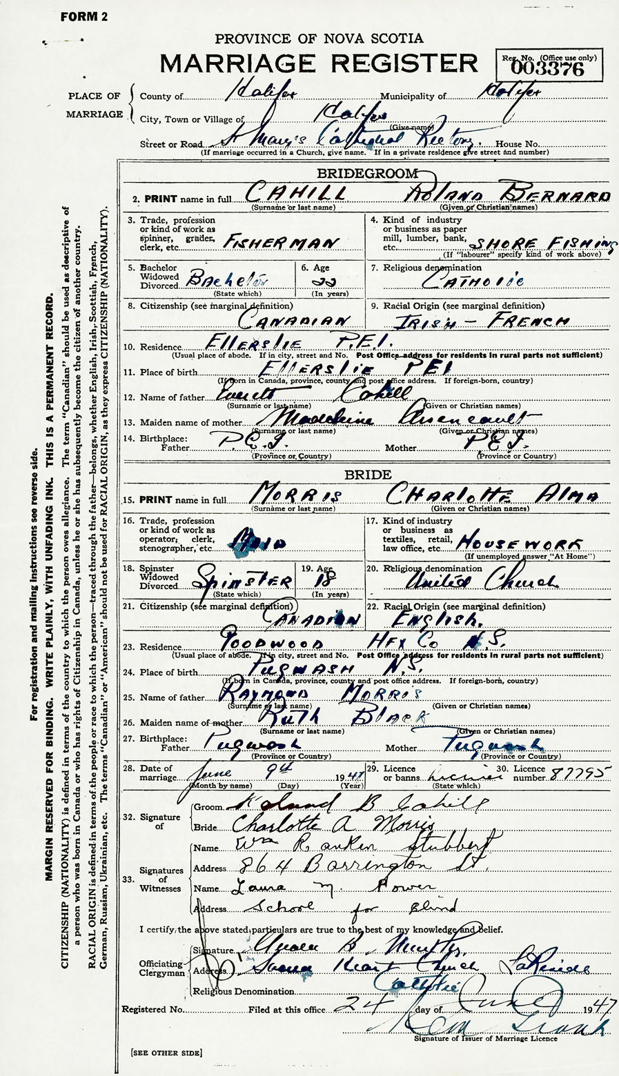 28. Date of marriage June 9 1947 29. By license or banns License 30. License number 87795