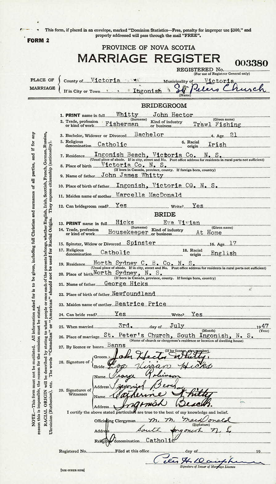 26. Place of marriage St. Peter's Church Ingonish, Victoria County