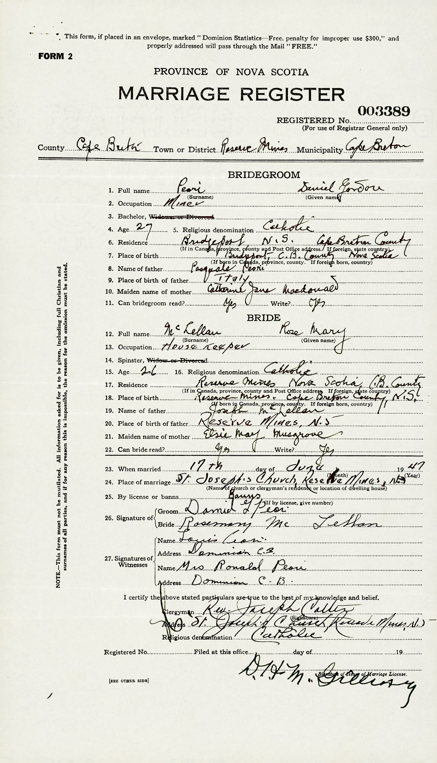 PLACE OF MARRIAGE County of Cape Breton in City or Town Reserve Mines
