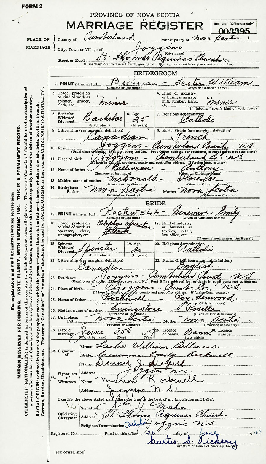 28. Date of marriage June 25 1947 29. By license or banns License 30. License number Bans