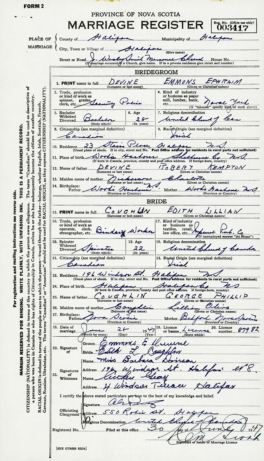 28. Date of marriage June 28 1947 29. By license or banns License 30. License number 87982