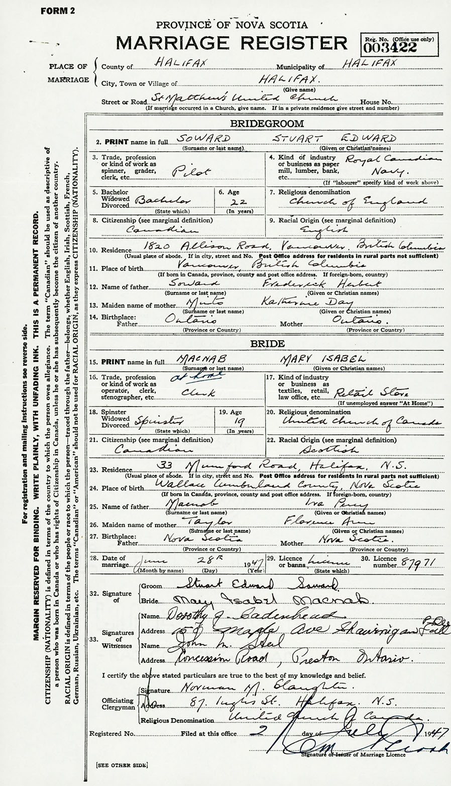 28. Date of marriage June 28 1947 29. By license or banns License 30. License number 87971