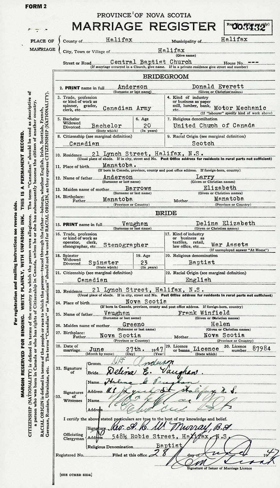 28. Date of marriage June 27 1947 29. By license or banns License 30. License number 87984