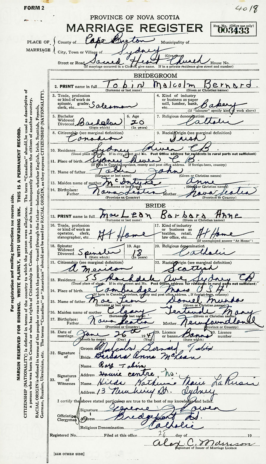 Registration: Year: 1947 number: 003433