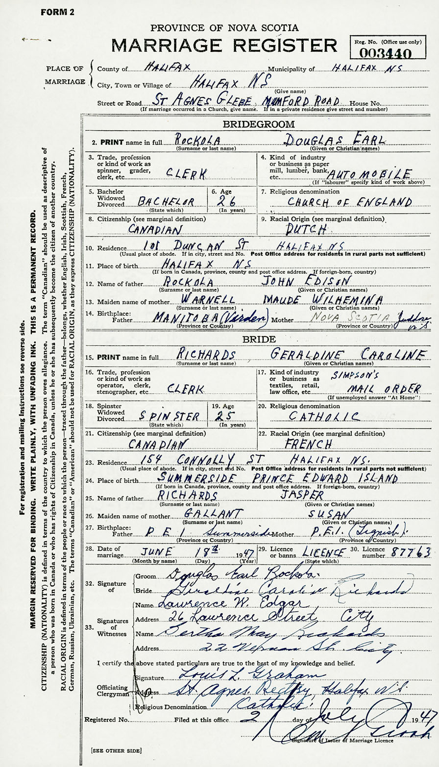 28. Date of marriage June 18 1947 29. By license or banns License 30. License number 87763