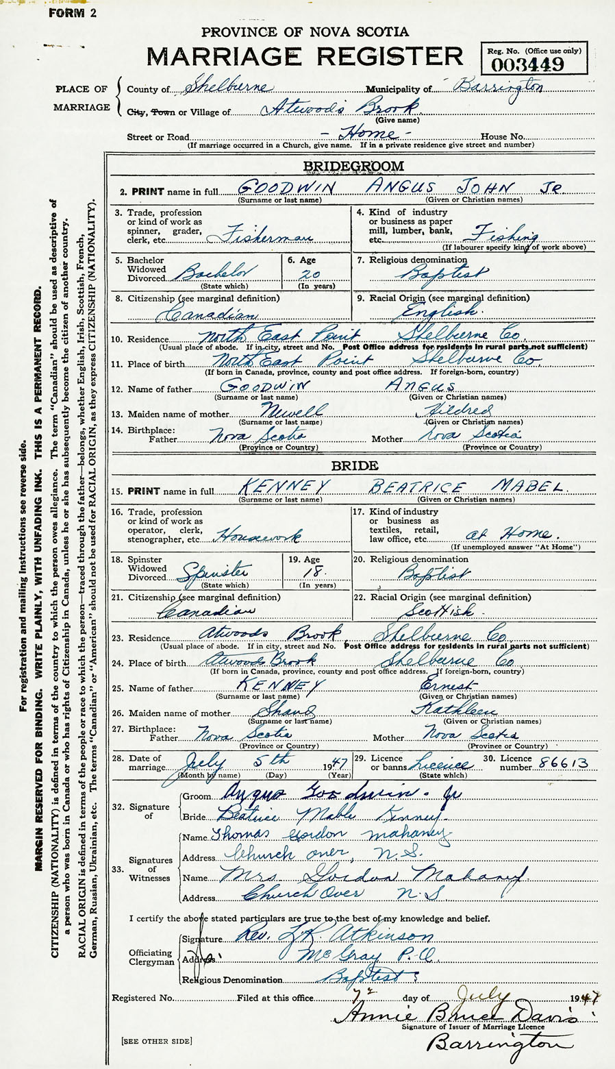 28. Date of marriage July 5 1947 29. By license or banns License 30. License number 86613