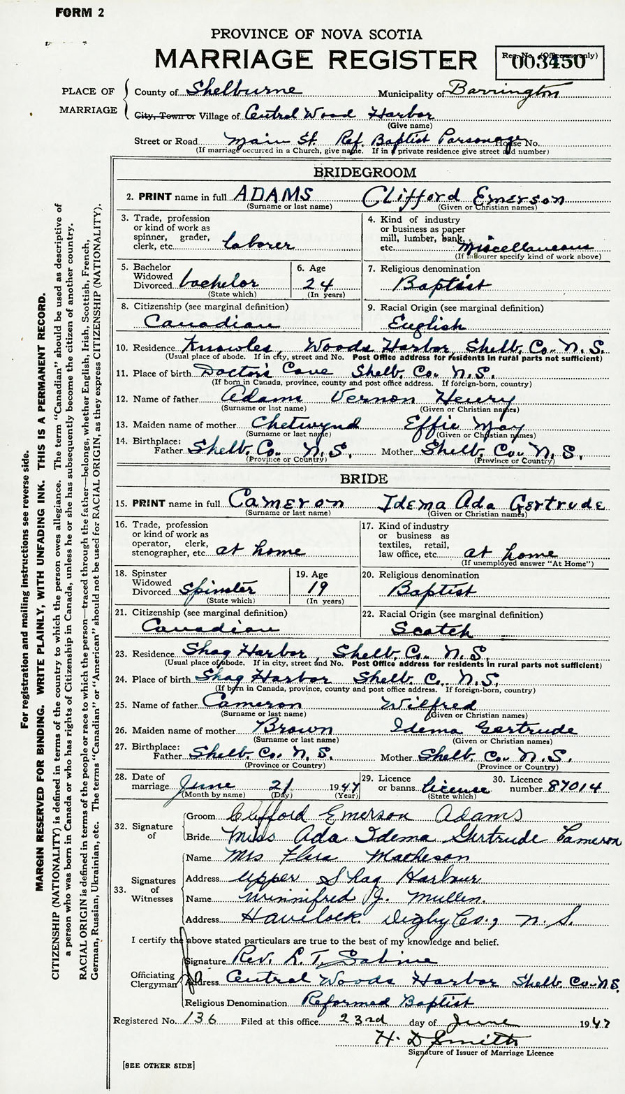 24. Place of birth Shag Harbor, Shelb. County Nova Scotia
