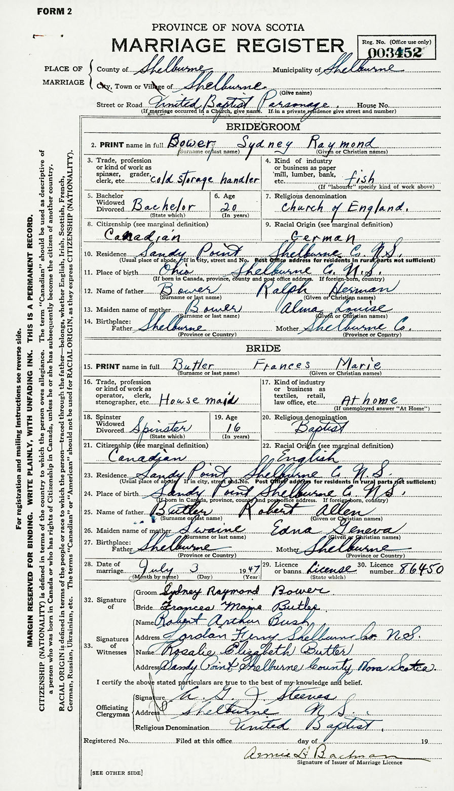 28. Date of marriage July 3 1947 29. By license or banns License 30. License number 86450