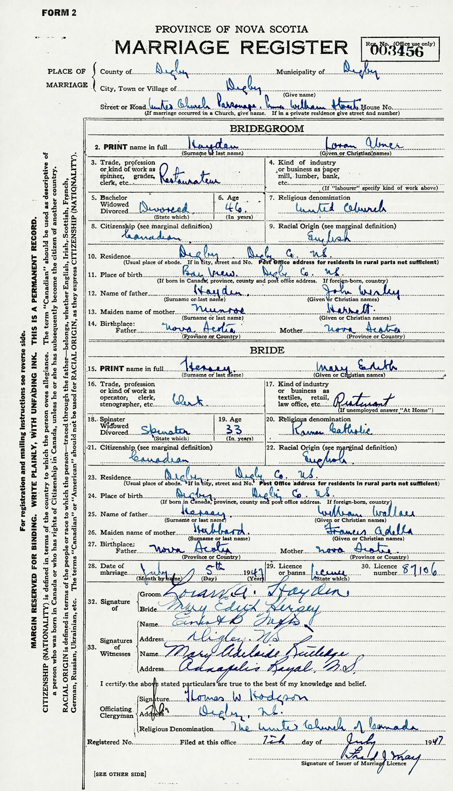 28. Date of marriage July 5 1947 29. By license or banns License 30. License number 87106
