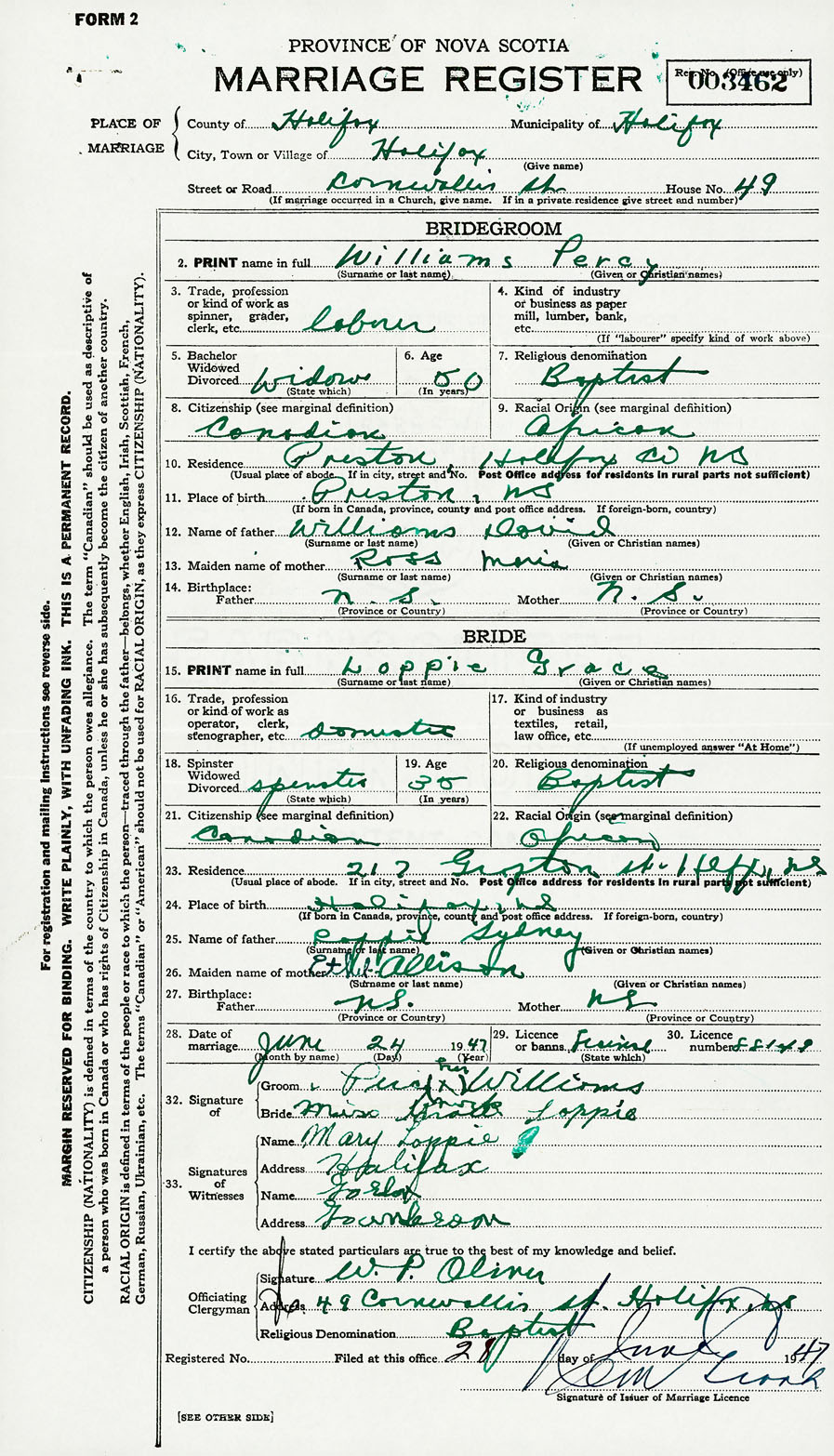 28. Date of marriage June 24 1947 29. By license or banns License 30. License number 88149