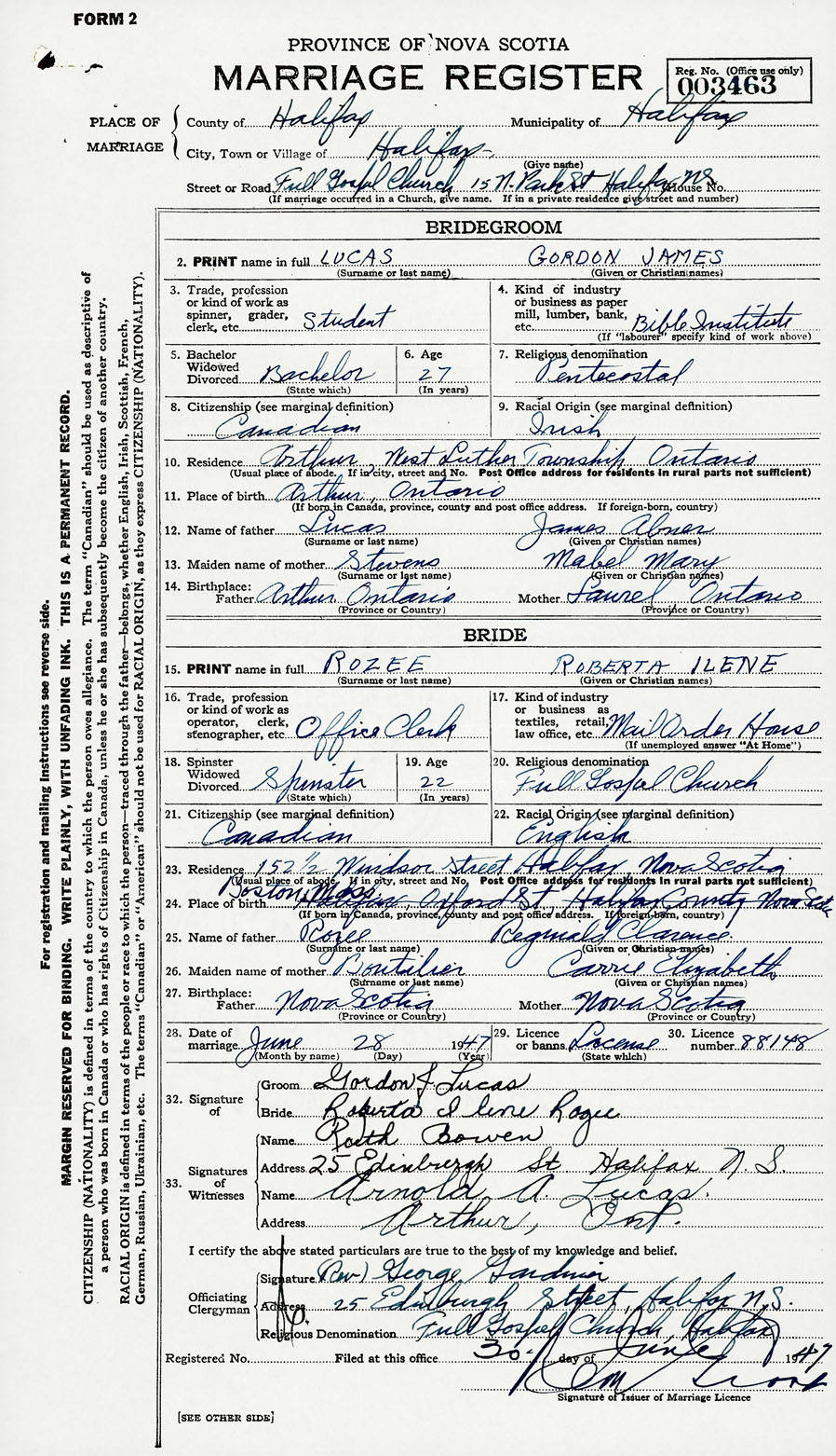 28. Date of marriage June 28 1947 29. By license or banns License 30. License number 88148