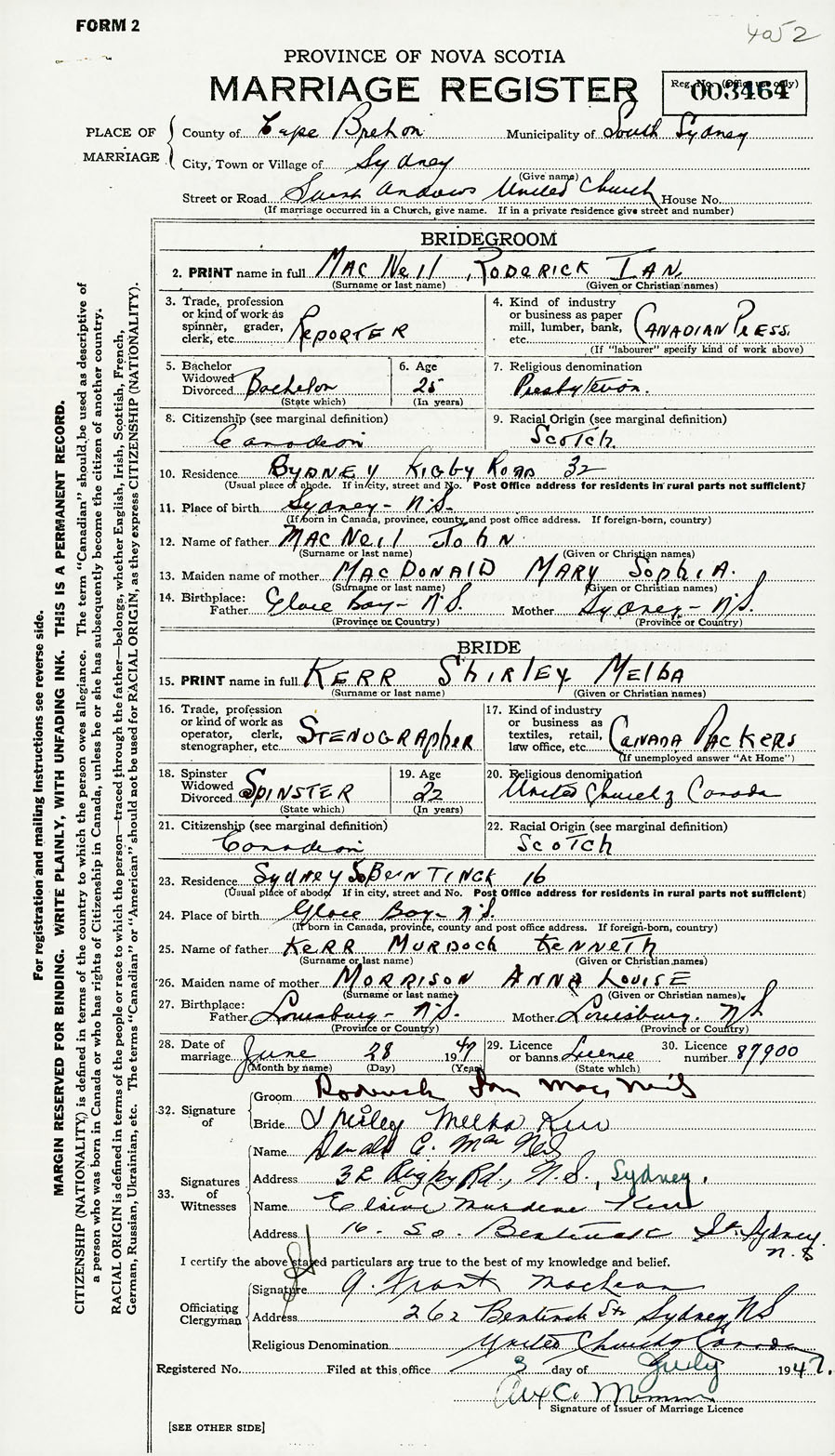 28. Date of marriage June 28 1947 29. By license or banns License 30. License number 87900