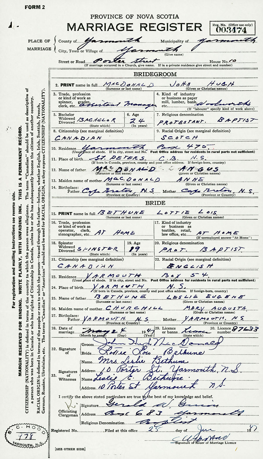 27. Birthplace Father Yarmouth Nova Scotia Mother Yarmouth Nova Scotia