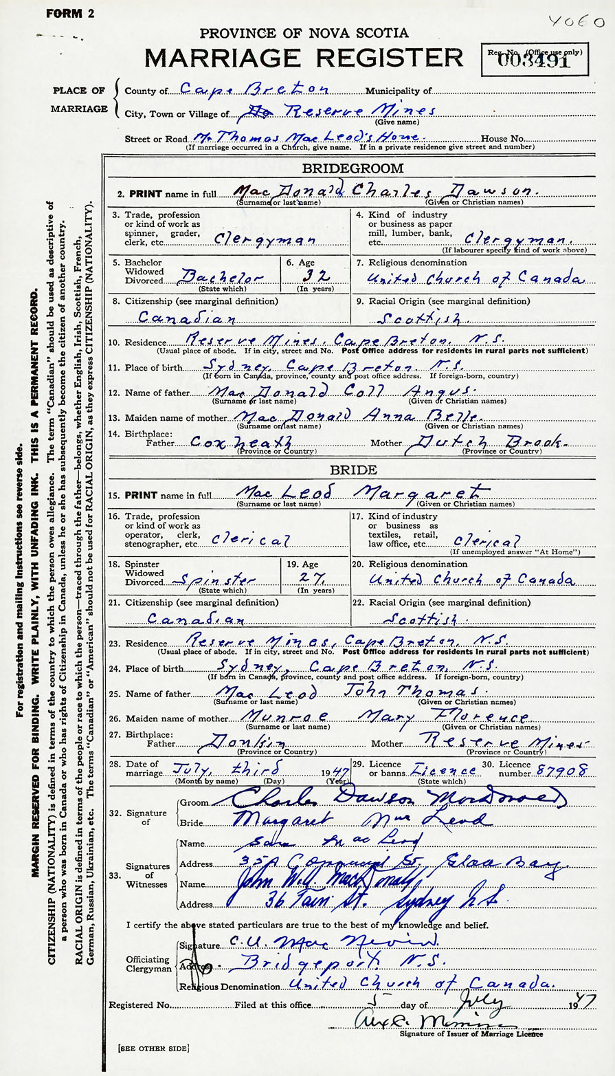 28. Date of marriage July 3 1947 29. By license or banns License 30. License number 87908