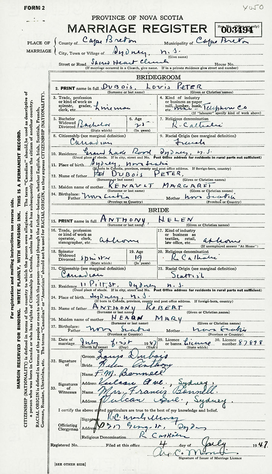 28. Date of marriage July 1 1947 29. By license or banns License 30. License number 87898