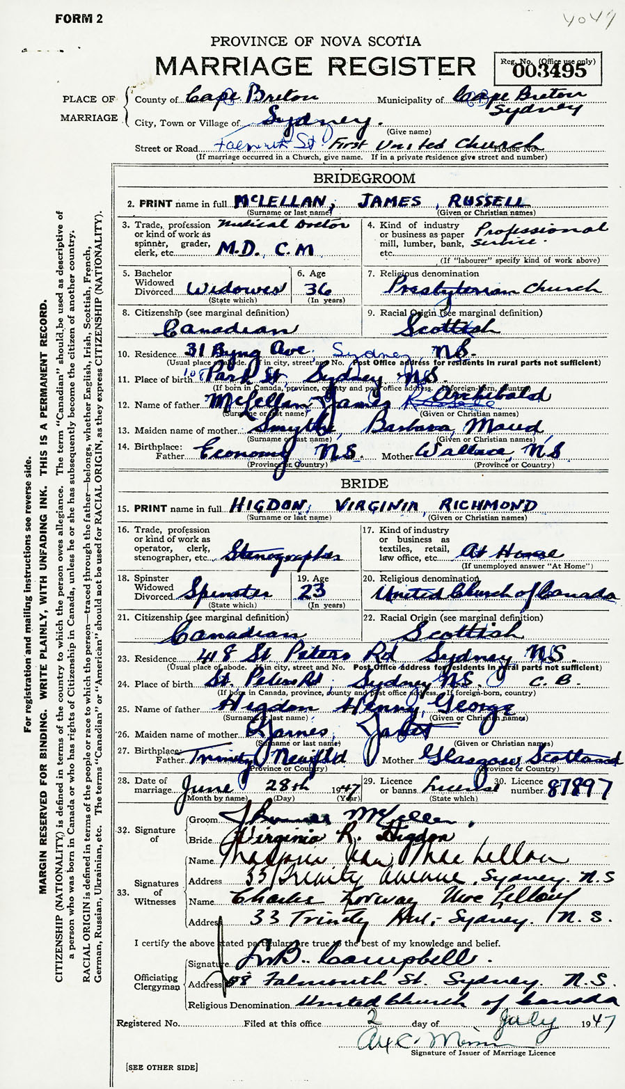 28. Date of marriage June 28 1947 29. By license or banns License 30. License number 87897