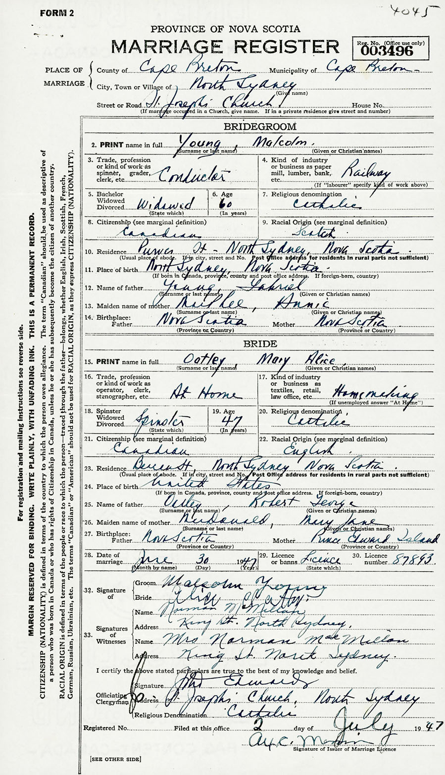 28. Date of marriage June 30 1947 29. By license or banns License 30. License number 87893