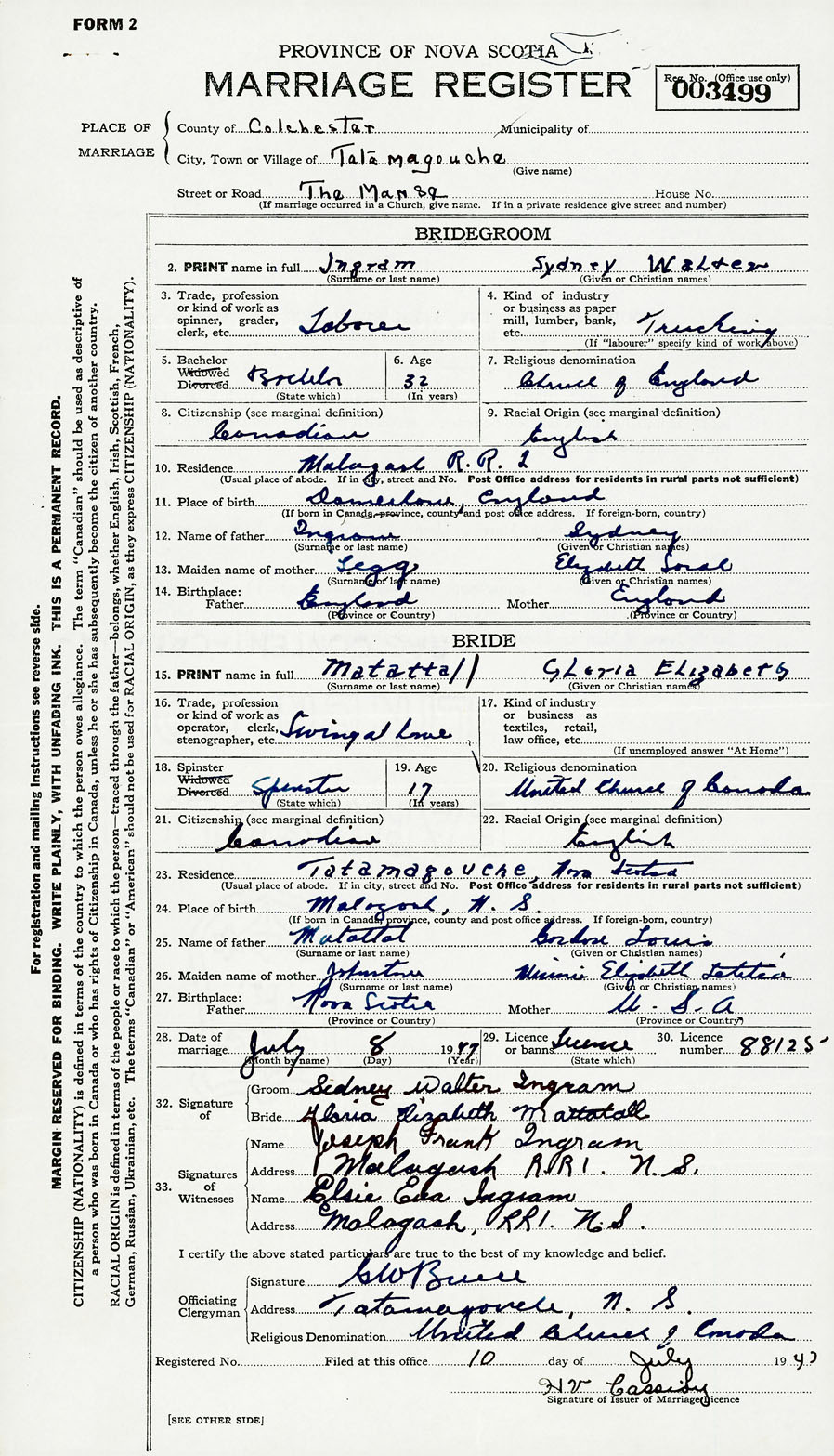 28. Date of marriage July 8 1947 29. By license or banns License 30. License number 88125