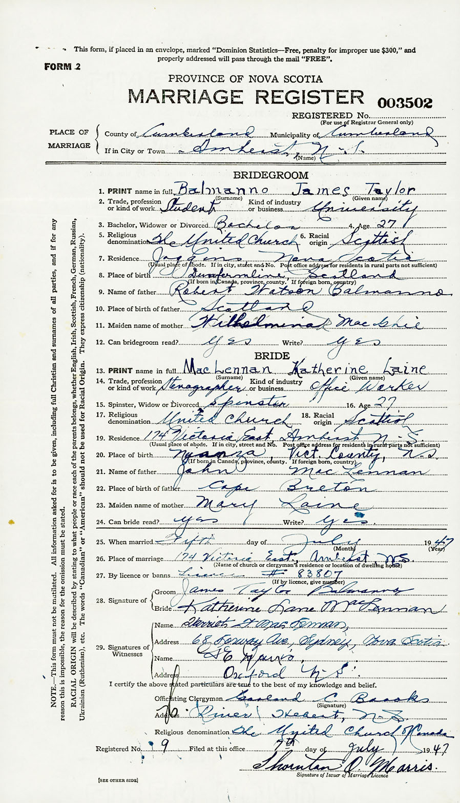 5. Religious denomination United Church of Canada 6. Racial origin Scottish