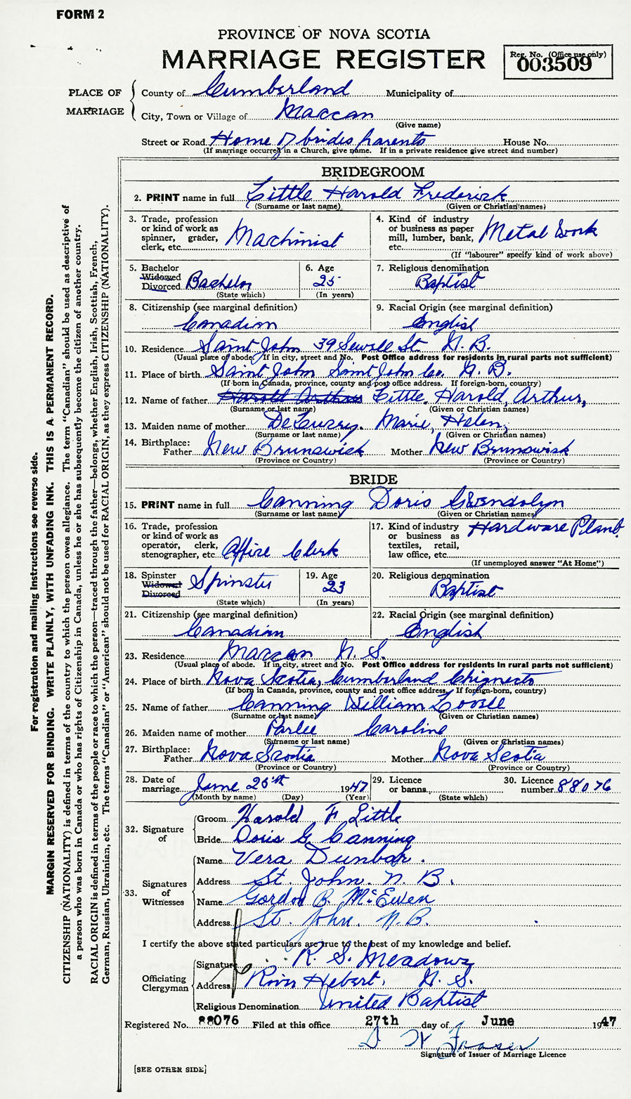 28. Date of marriage June 25 1947 29. By license or banns License 30. License number 88076