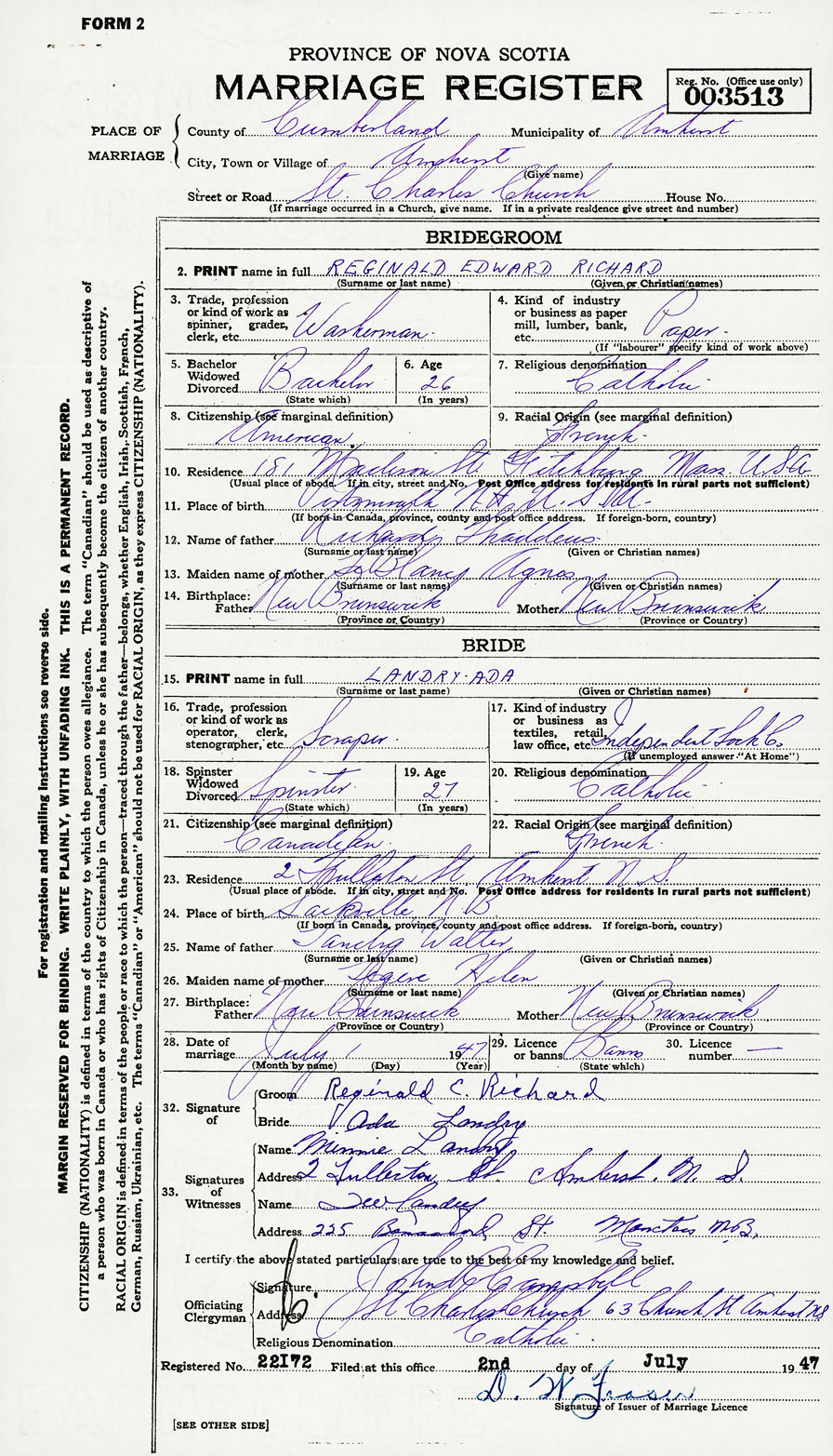 28. Date of marriage July 1 1947 29. By license or banns License 30. License number Banns