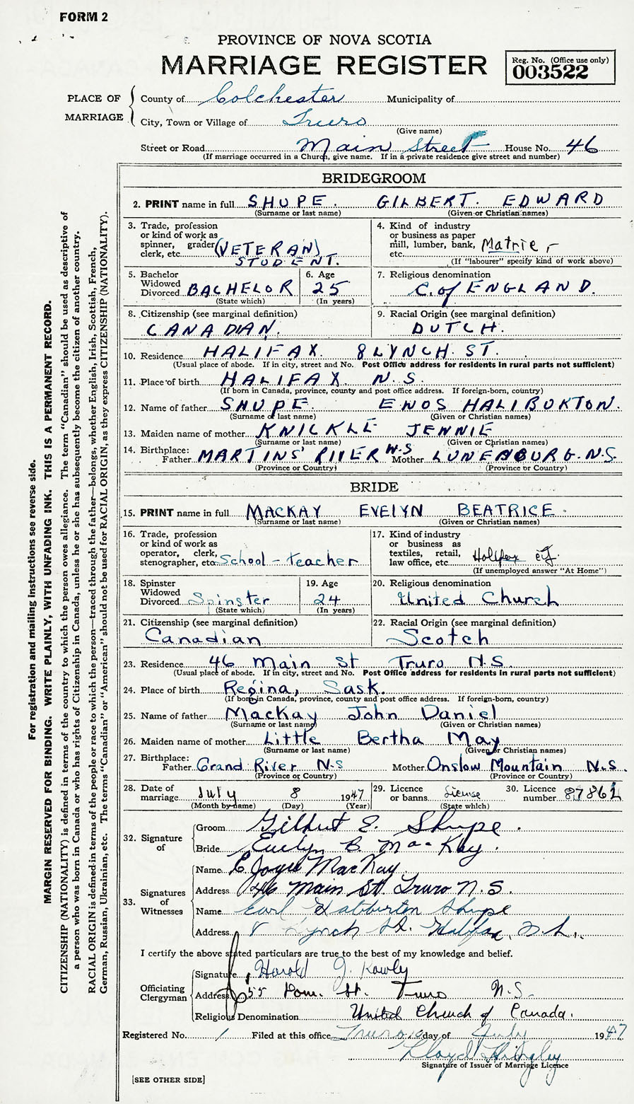 28. Date of marriage July 8 1947 29. By license or banns License 30. License number 87862