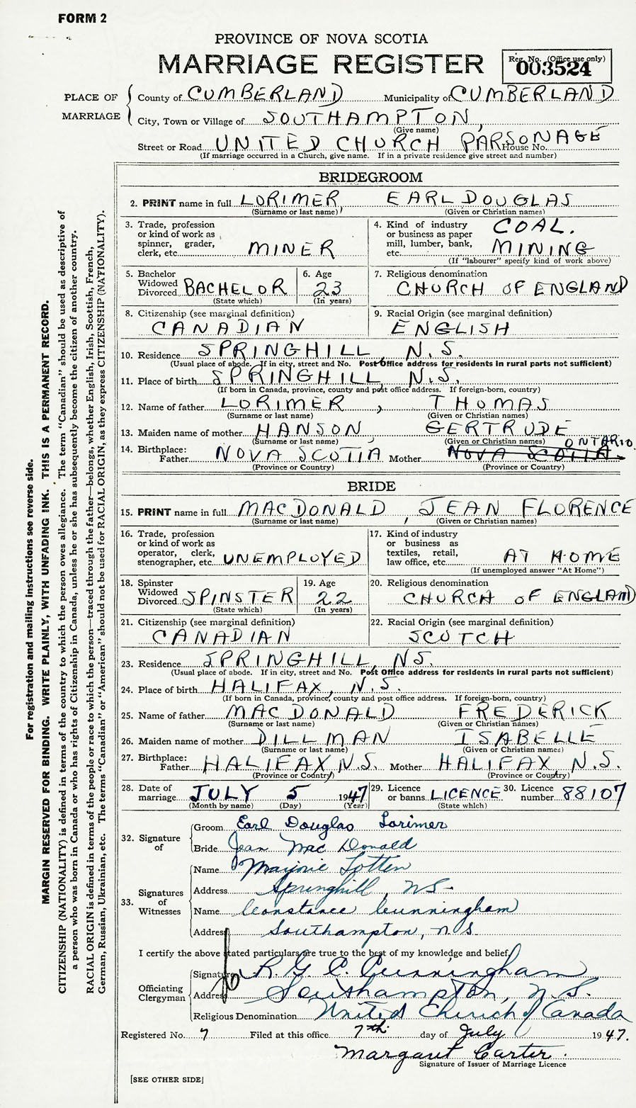 28. Date of marriage July 5 1947 29. By license or banns License 30. License number 88107