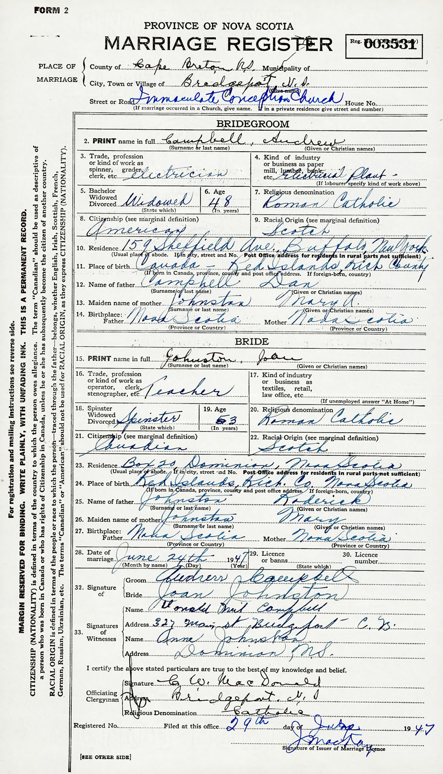 28. Date of marriage June 24 1947 29. By license or banns License 30. License number