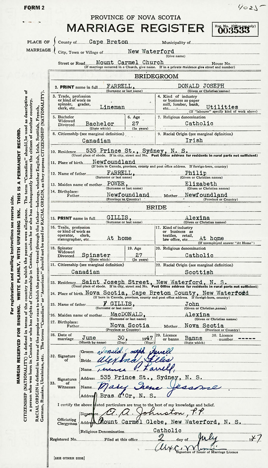 Officiating Clergyman A. A. Johnston, P.P.